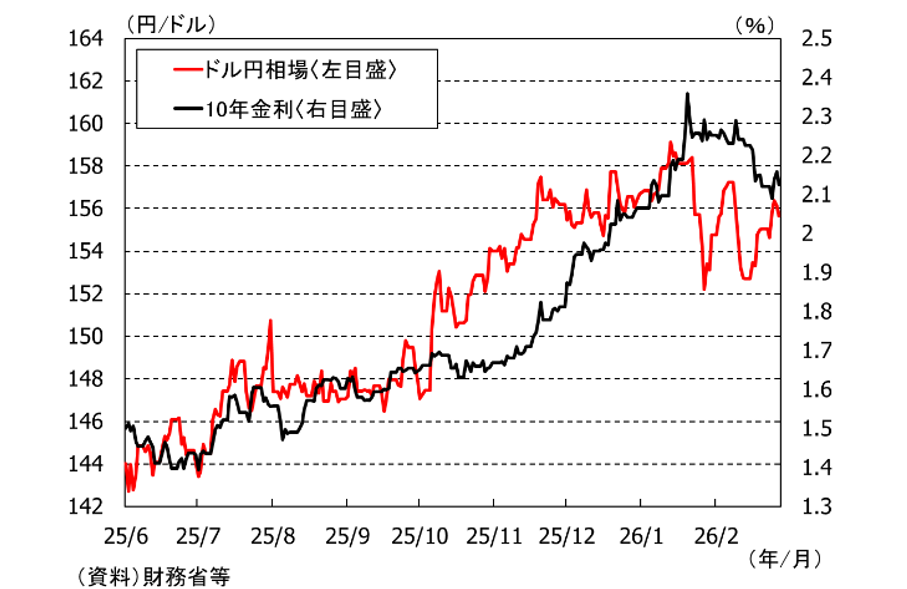 2月8日投開票の衆議院選挙では、自民党が単独で議席の3分の2を確保し大きな勝利を収めました。一方、金融市場では、自民党が食料品の2年間消費税ゼロを公約に掲げたことを受け、その財源への懸念から円安と金利上昇が進みました。ドル円は一時1ドル159円台を付け、10年金利は一時2.3%まで上昇しました(図表1)。もっとも、1月23日以降に日米当局が為替介入の前段階であるレートチェックを行ったこと、衆院選での自民党の勝利後に高市首相が財源は赤字国債に頼らないと述べ、市場に配慮する姿勢をみせたことから円安と金利上昇は一服しています。