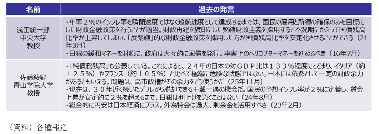 高市首相は従前から金融緩和路線を志向していますが、衆院選後も利上げに消極的な情報発信が多くなっています。2月16日に行われた植田日銀総裁との会談では、高市首相が追加利上げに難色を示したと報道されたことに加え、6月までに任期が到来する審議委員2名の後任として、25日に政府からリフレ派の浅田氏と佐藤氏が提示されました。浅田氏は過去に日銀の緩和マネーを財源に政府が大々的に国債を発行し事実上のヘリコプターマネーを行うべき、との提言を行っているほか、佐藤氏は高市首相に近い自民党議員で構成される「責任ある積極財政を推進する議員連盟」で講師を務めた経験があり、24年7月に日銀が利上げを決定した際には「利上げを急ぐことはない」と主張していました(図表5)。