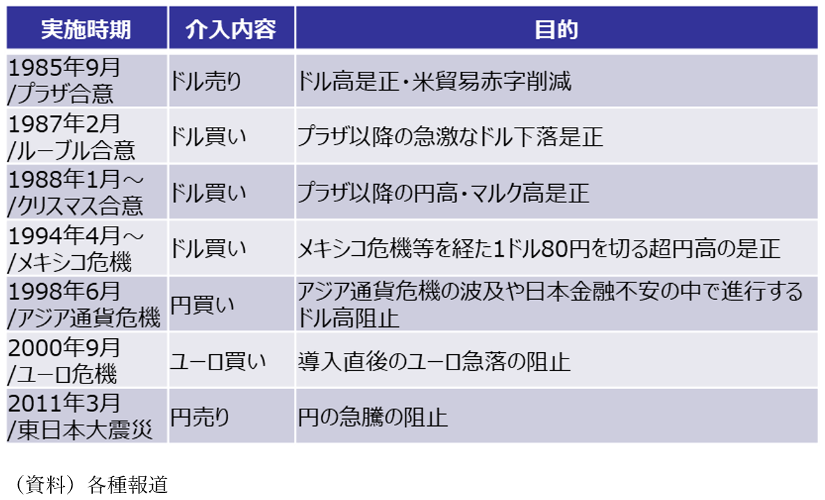 まず、為替の動きを振り返ってみると、昨年10月に高市首相就任以降、1ドル148円程度で推移していたドル円相場は円安が進行し、1月23日の決定会合で植田日銀総裁が次回の利上げについて明確な情報発信をしなかったことを受け、160円手前まで円は下落しました。しかし、その直後に日本がレートチェックを行ったことで157円台、日本時間の24日未明には米国のレートチェックにより154円台まで円高が進行しました。レートチェックとは中央銀行が取引銀行に取引水準を問い合わせることで、実際に政府・中央銀行が通貨を売買する為替介入の前段階に当たります。2月24日の新聞報道では、今回の日米協調レートチェックが米国主導で行われ、日本側の要請があれば協調介入に踏み切ることも視野に入れていたということが判明しました。これまで日本単独での為替介入は24年の4月、5月、7月に行われるなど比較的多く実績がありますが、日米協調の為替介入は前回が2011年3月の東日本大震災時でその前が2000年9月のユーロ危機時と、経済危機や天変地異等の対応で行われてきたため、レートチェックが米国主導かつ協調介入も視野に入れていたことは市場でも驚きをもって受け止められました(図表2)。