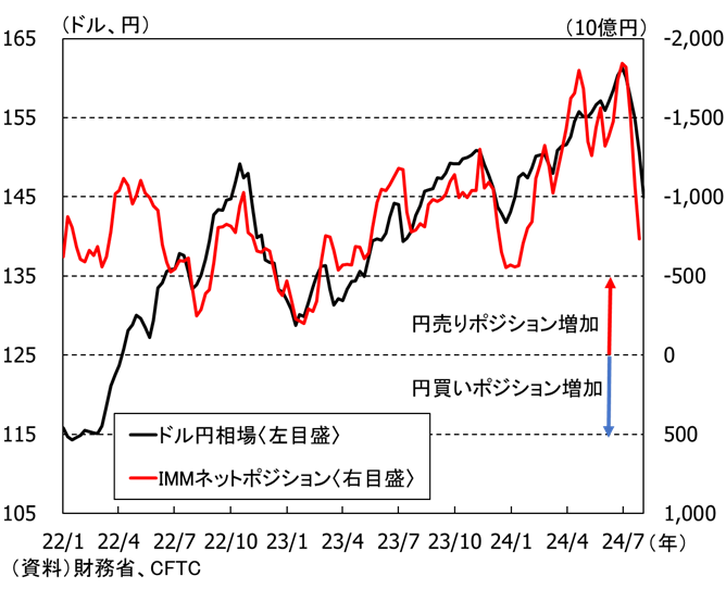 もっとも、7月初に1ドル161円台まで円安が進んだドル円相場は、米国の弱い経済・物価指標や日本政府の為替介入を経て円高方向に推移しました。31日の決定会合後は1ドル150円を割り込み、弱い米雇用統計の結果も相俟って8月5日には一時1ドル141円台まで円高が進行しました。足元8月6日時点は1ドル145円程度で推移しています。そうした中、7月30日時点でIMMの円売りポジションは大きく巻き戻されており、日本の決定会合や米雇用統計の結果を受け、足元ではさらに縮小しているものと想定されます。