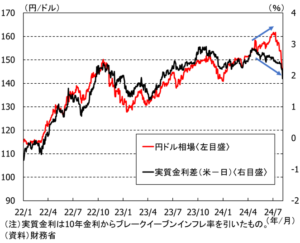 これまでのドル円相場の動きをみると、24年4月頃までは日米の金利差に連動して動く傾向にありましたが、それ以降は日米の金利差が縮小する一方で為替は円安方向に進行しました(図表4)。為替が金利差と逆方向に動いた背景として、日本の国力低下や貿易赤字の拡大等を挙げる声もありますが、円キャリートレードの加速が最も大きな要因だったと考えています。