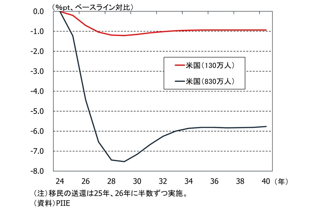 米国の平均的な成長率である潜在成長率は前年比+2%強、足元のインフレ率は3%程度であるため、仮に通商政策だけでも中国60%とその他の国10%の追加関税がフルに実行されれば、景気に大きく下押し圧力が掛かる一方、インフレが大きく上昇するスタグフレーションに陥る可能性があると想定されます。また、関税は継続的に上げ続けない限りは前年比でみた物価や経済への悪影響は一時的なものになりやすい一方、移民に関しては強制送還に加えて流入抑制が続けば、米国の労働者数の増加を抑え続けることで経済の下押しが続くことになるため、より悪影響が長引く可能性があると思われます。