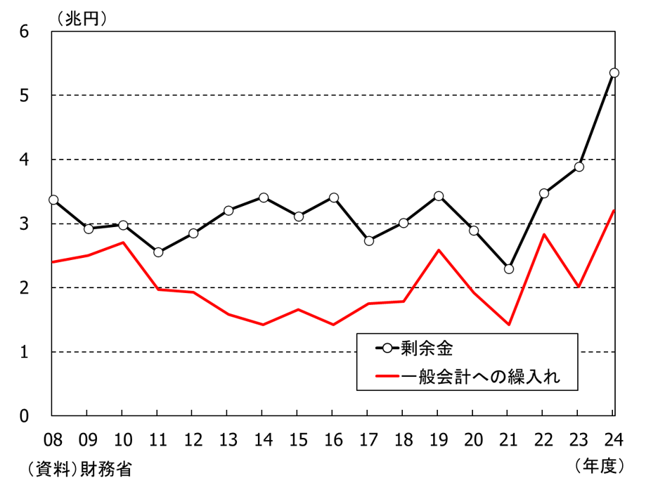 外貨預金の大半がドルと想定され、外為特会のドル預金は円買い・ドル売りの為替介入の原資になっています。これを対米投資に使うということは、円安が進みすぎた場合に円買い・ドル売りの為替介入が出来なくなることを意味します。また、外為特会が保有する外貨証券からは運用益(剰余金)が上がっており、24年度は5.3兆円にもなりました(図表5)。