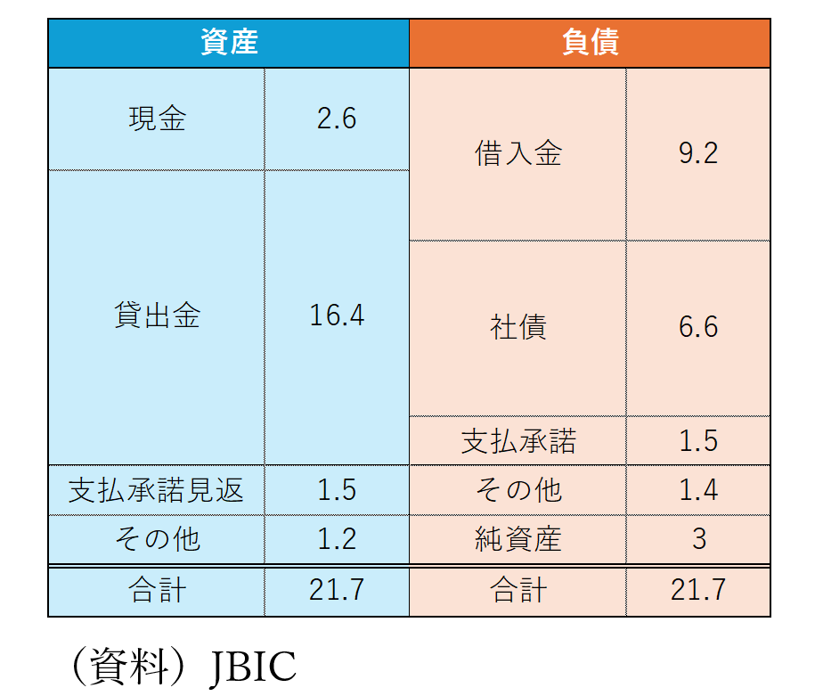 次に、JBIC(国際協力銀行)が政府保証付きのドル建て債券で調達するということに関して、JBICの24年3月のバランスシートをみてみますと、総資産は21.7兆円です(図表6)。約83兆円の対米投資の半分をJBICが担うとすると、バランスシートが現在の3倍にまで膨れ上がることになり、ほぼ対米投資の会社になることになります。