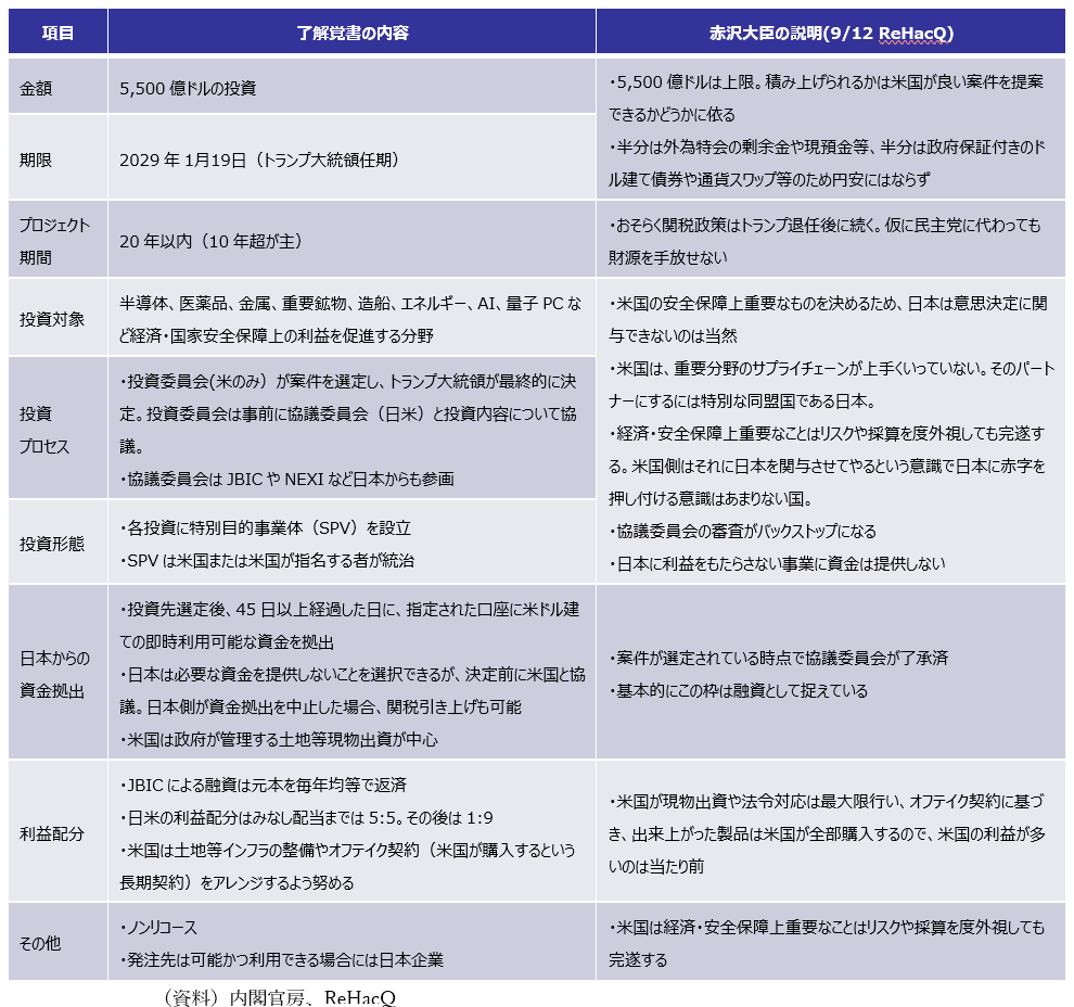 5,500億ドルの対米投資に関して、日本側は当初あえて文書を結ばず曖昧にして乗り切るということを想定していたようですが、そうした姿勢を見透かされる形で米国から文書での明確化を求められ、双方の合意内容が記載された了解覚書(Memorandum of Understanding)が作成されることになりました。その了解覚書と9月12日にReHacQというYouTubeで日米交渉を担当した赤沢大臣が説明した内容を下表に纏めています(図表2)。