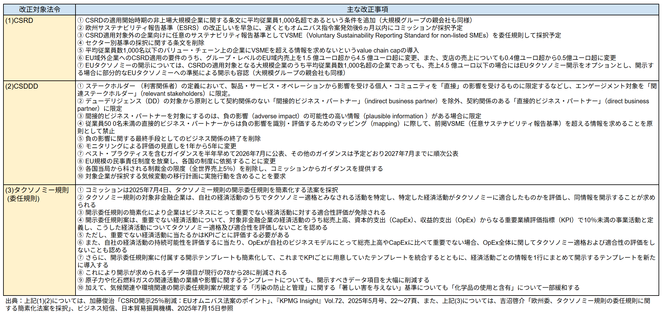 12.加藤俊治「CSRD開示25%削減:EUオムニバス法案のポイント」、『KPMG Insight』Vol.72、2025年5月号、22~27頁、(閲覧日2025年8月29日)および吉沼啓介「欧州委、タクソノミー規則の委任規則に関する簡素化法案を採択」、ビジネス短信、日本貿易振興機構、2025年7月15日、(閲覧日2025年8月29日)を参照して引用した。