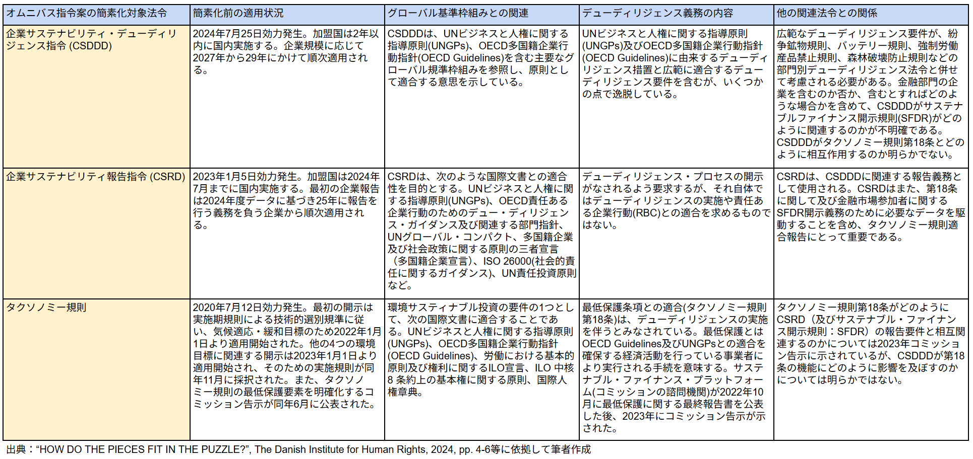 「[オムニバス指令案]で提示されている措置はCSRD、CSDDD、タクソノミー委任規則の適用範囲を調整し、それらに定められた一定の要件を変更するものである。とくに当該変更は、報告企業の規模を報告要件の潜在的な重複の負担を調整している。15